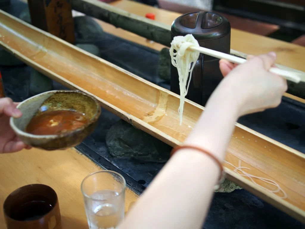 Bamboo-slide noodles—catching them at the right time is part of the fun!