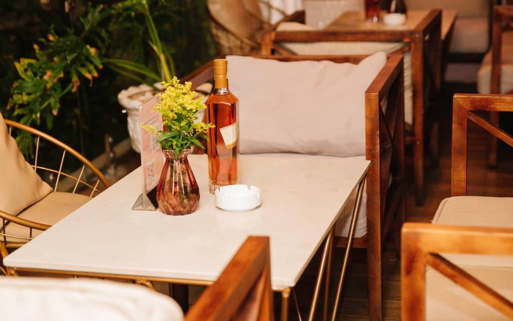 The luxurious cafe stands out with white tones, a lively music space every evening