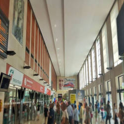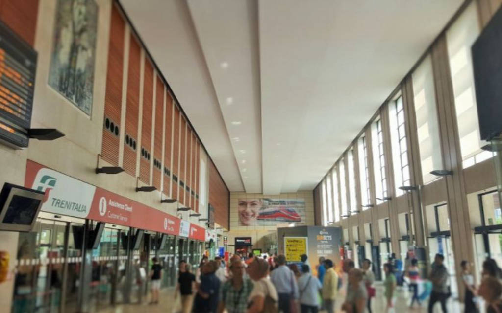 Bên trong nhà ga, du khách được chào đón bởi một nhà ga rộng rãi và nhộn nhịp, có kính cao vút và mái che bằng sắt giúp không gian tràn ngập ánh sáng tự nhiên. Nội thất vẫn giữ được cảm giác quyến rũ vượt thời gian với cửa sổ hình vòm, gạch trang trí và sàn đá cẩm thạch bóng loáng.