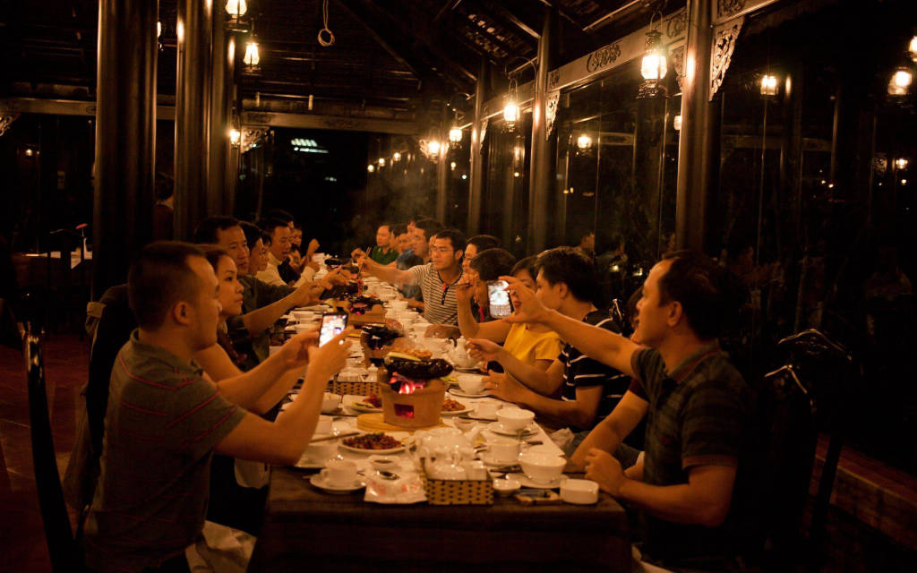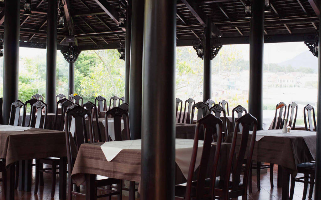 Trước nhà hàng là chiếc cổng với những cây cột bằng gỗ mun, mái ngói nâu mang đậm phong cách làng quê Việt Nam. Xung quanh nhà hàng được rào bằng bức tường đá kiên cố gợi nhớ những ngôi nhà của tầng lớp giàu có Việt Nam thời xưa được bao bọc cẩn thận. Bước vào bên trong, dọc lối đi trồng rất nhiều cây hoa rực rỡ như hoa Đỗ Quyên, Phượng Hoàng và trang trí nhiều hồ cá nhỏ với tiểu cảnh xinh xắn. Không gian bên trong nhà hàng có tu sửa lại những đường nét cổ xưa nhằm mang lại phong cách hiện đại hơn bằng cách kết hợp lớp kính trong suốt để không gian vừa ấm cúng vừa có thể liên kết với thiên nhiên bên ngoài tạo cảm giác rộng rãi. Nhà hàng có hai tầng và chia làm nhiều khu vực để phục vụ số lượng khách khác nhau. Ở tầng dưới chủ yếu phục vụ cho các gia đình, còn tầng trên thoáng đãng và rộng rãi hơn dành cho số lượng lớn khách tổ chức tiệc hay khách đoàn tới dùng bữa.