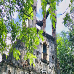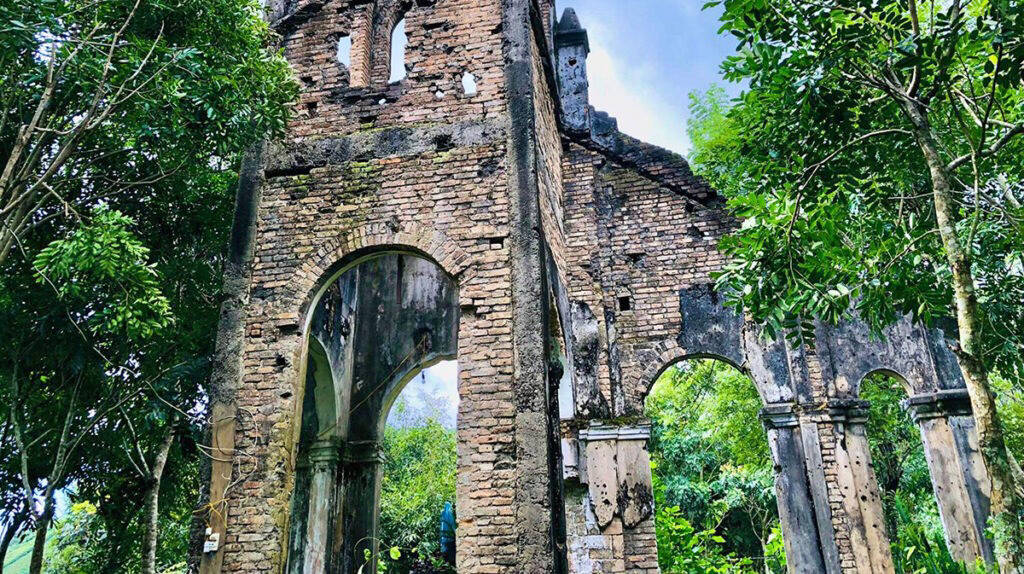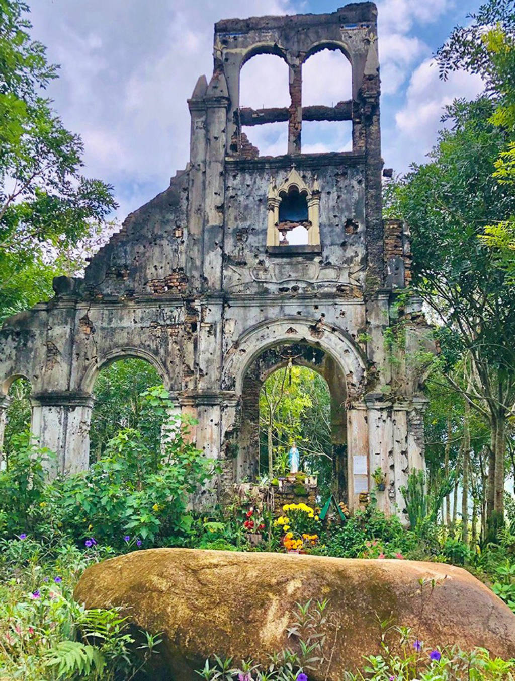 Over the past 100 years, the church has witnessed many changes of the historical flow of time along with the devastation of war, making H'Bau church today not as intact as before. The church now only has the ruins of mossy bell towers between the green of the trees and the front area of the church. However, up to now, the ancient church of H'Bau still retains its wild beauty, inherent ancient features and every year the Jrai people still often return to the old church - H'Bau church. to offer flowers and pray. Under the bell tower, the statue of Jesus crucified on the cross is solemnly hung as a memorial of the Jrai people to the ancient church that is gradually being buried by time.