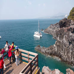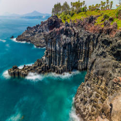 If you follow the farm road about 600m southwest from Daepo-dong, the end of the pine forest is a cliff. At the foot of this cliff is the Jisatgae Coast with its towering stone pillars. Jusangjeolli are stone pillars stacked along the coast and are a designated natural monument of Jeju Island. Jusangjeolli Cliff was formed when lava from Hallasan Mountain erupted into the Jungmun Sea. They are cubic or hexagonal stone pillars of various sizes and are almost as if the stone masons carved them. The county government named them 'Jisatgae Rocks' from their old name 'Jisatgae'. The 20m-long cliff makes it a popular spot for high tide watching and sea fishing. The waves of the high tide crash against the cliffs providing a breathtaking view of the ocean surrounding the pillars.
