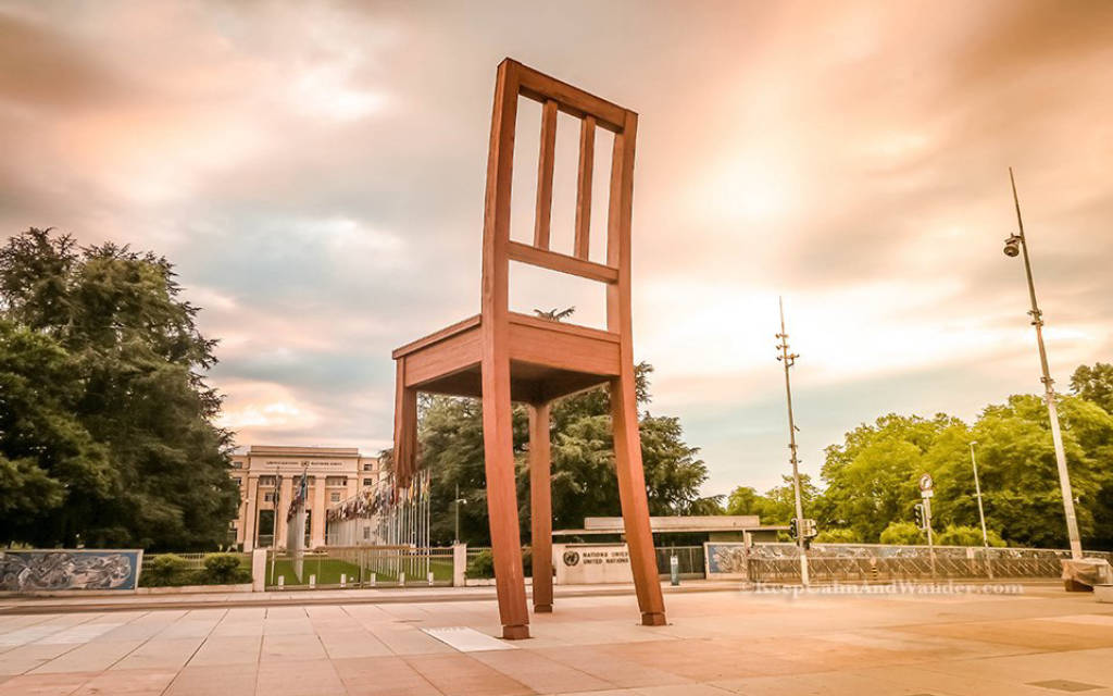 This artistic broken chair is a symbol of human rights activities, historical activities and the result of a long struggle with a lot of effort.