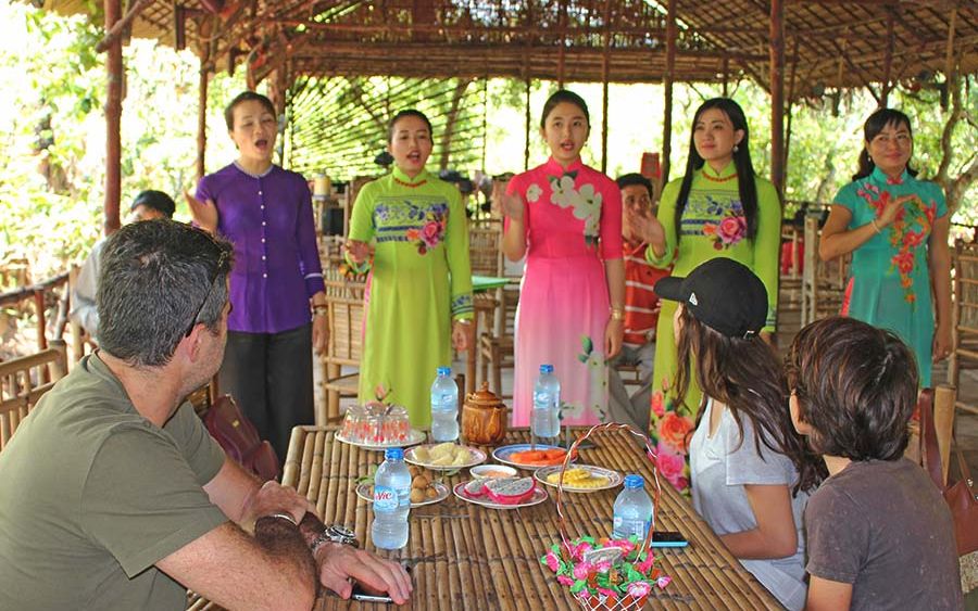 12:45 Đi thuyền đến nhà hàng và thưởng thức bữa trưa truyền thống Việt Nam với 7 món ngon: Cá tai tượng (một món ăn rất đặc biệt ở đồng bằng sông Cửu Long), bánh tráng ăn kèm nước mắm và các món ăn khác.
