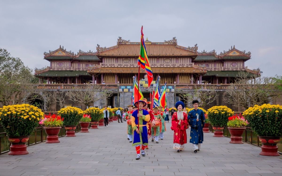 🎎 Arriving in Hue, the delegation visited the Imperial City of Hue - where the Nguyen Dynasty kings used to celebrate Tet, admiring the solemn royal palace space with brilliant red and yellow colors. This is an opportunity for families to "ask for royal blessings" together, praying for a prosperous year.