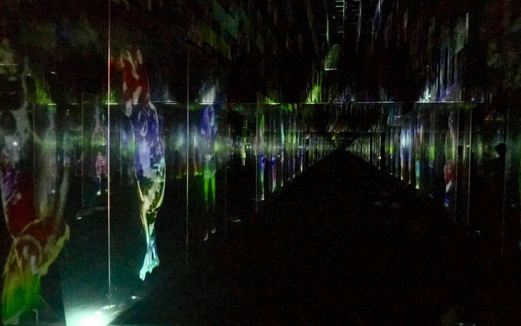 - Phòng kính vô cực Đây là một căn phòng chứa đầy những tấm kính lớn treo thành hàng. Một vài tác phẩm nghệ thuật bắt nguồn từ không gian này và trôi ra ngoài hành lang. Ví dụ tác phẩm " Hòa bình có thể được hiện thực hóa ngay cả khi không có trật tự " với mỗi tấm kính chứa một vũ công hoặc nhạc sĩ duy nhất đôi khi họ dừng lại hoặc phản ứng nếu ai đó đi ngang qua, khung cảnh khiến ta tưởng tượng đến hàng trăm linh hồn đang mắc kẹt ở cõi hồng trần . Vào những thời điểm khác, bạn có thể nhìn thấy những loài động vật có hoa rình rập trên các ô kính hoặc một biển hoa sen khổng lồ, rực rỡ, màu hồng nở.