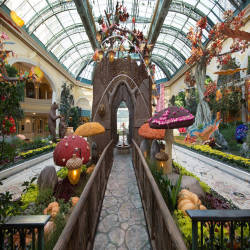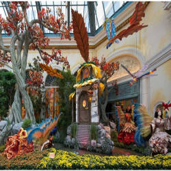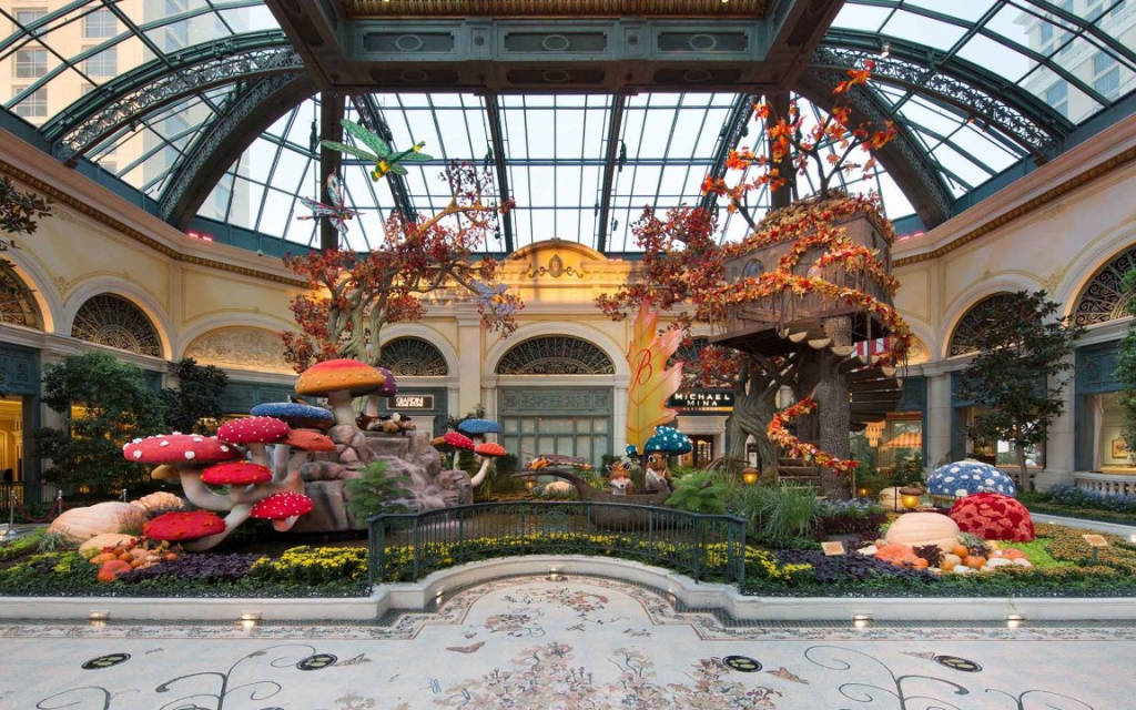 Buổi trưng bày mùa thu “Into The Woods” trong Khu vườn bách thảo nhà kính tại khách sạn Bellagio là một trong những cảnh quan đẹp mắt mang đến trải nghiệm nổi bật bởi một khu rừng kỳ diệu và dàn sinh vật được thiết kế kỹ lưỡng. Du khách sẽ cảm giác như mình đang ở trung tâm của một khu rừng với nấm, hoa, tán lá sồi quá khổ và những chú chuồn chuồn xinh đẹp đang nhảy múa trên đầu. Khi bước vào khu vực phía tây của khu vườn, du khách được chào đón bởi một gia đình cáo đang chơi sâu trong rừng bên dưới một ngôi nhà trên cây lộng lẫy, được trang trí bằng hoa, có cửa sổ hình chuồn chuồn bằng kính màu đầy màu sắc. Trong khu vườn phía bắc, bốn nàng tiên nằm bên một cái ao tĩnh lặng đang phản chiếu bóng của họ. Trong đó, mỗi nàng tiên đều mặc một chiếc váy dạ hội được thiết kế riêng được tạo ra từ những bông hoa đầy màu sắc và các vật trang trí tự nhiên. Ngôi nhà cổ tích trong rừng của họ bên cạnh đó được xây hoàn toàn bằng thực vật, có mái hướng dương và cửa sổ kính màu. Ở cuối khu vườn, ong mật và một gia đình gấu tụ tập gần một chậu mật ong trong cây biết nói cao 8.5m của khu trưng bày. Nhà thiết kế Ed Libby cho biết: “'Into The Woods" chứa đầy cảm hứng về sự biến đổi, suy tư và truyền cảm hứng cho người xem thông qua những tác phẩm hoa tuyệt đẹp.
