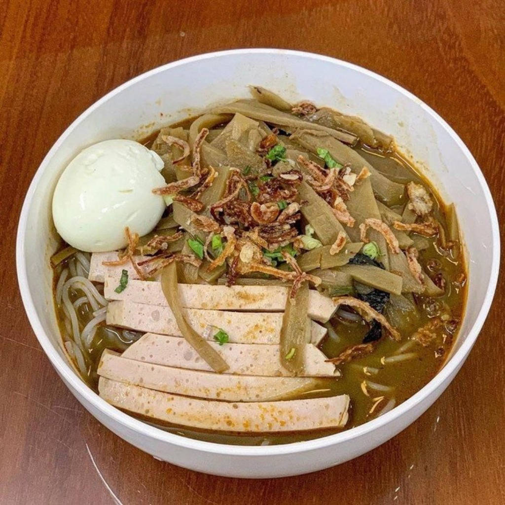 Bên cạnh đặc trưng về nước dùng món ăn này còn có thành phần nguyên liệu rất phong phú là măng le tươi tạo độ ngọt, da heo chiên giòn rụm, bún sợi dẻo dai. Đặc biệt, món bún này người ta sẽ ăn rất cay để át đi vị tanh của cua, đồng thời tăng độ nồng ấm tạo sự hài hòa về hương vị.