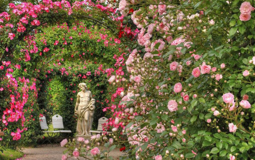 Mặc dù tên là Rose Garden, vườn hoa cũng được biết đến với sự đa dạng của các loài hoa. Hơn 400 loàn hoa hồng và hoa diên vĩ (iris) cũng như 28 cây đỗ quyên khác nhau nở rộ khắp công viên. Một hồ hoa súng đầy mê hoặc với đài phun nước và những khu vực cỏ xanh rộng lớn mang đến cho công viên một cảm giác thoáng mát thư giãn.