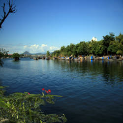 The Perfume River has two large tributaries, both originating from the Truong Son mountain range. Ta Trach branch comes from Long Cave, flows through 55 large and small waterfalls to Bang Lang fork. Huu Trach branch starts from the east of Chan Son mountain, flows through 14 waterfalls and then joins with Ta Trach stream at the upper fork. From Bang Lang fork to the sea, the river becomes wide, the water flows gently. All year round except for flood days, the river water is green.