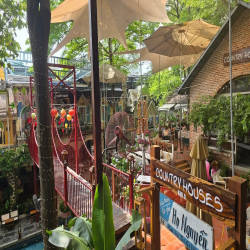 • Dòng suối và Cầu đá: Một hệ thống suối nhân tạo chảy quanh quán giúp điều hòa không khí luôn mát mẻ. Đứng trên những cây cầu gỗ nhỏ hướng tầm mắt về phía cối xay gió là góc máy "triệu view" tại đây.