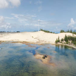 Làng Hải Ninh nay cũng đã đổi thay nhiều hơn trước, đặc biệt là ở đây đã mọc lên cả một “cánh đồng điện gió”. Những cột điện gió khổng lồ nằm xen giữa các đồi cát, hồ nước tạo thành một “tiểu sa mạc” nên thơ, trở thành điểm tham quan, checkin mới lạ cho giới trẻ. Giữa không gian mênh mông cát trắng, những trụ điện gió phản chiếu xuống hồ nước lung linh. Sau khi thỏa sức tạo dáng cùng xe địa hình để chụp ảnh, chúng tôi chạy một vòng quanh các cột trụ để ngắm nghía. Đến khi mặt trời đã đứng bóng, cả nhóm ghé vào một nhà hàng ven biển. Bữa trưa nhẹ nhàng với tô mì tôm mực do chính người dân đánh bắt từ biển trước làng. Dùng xong bữa, mỗi người tìm một chiếc võng nằm đung đưa hóng gió từ biển mát rượi.