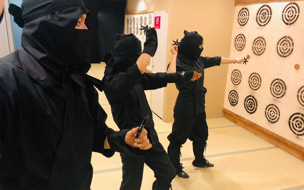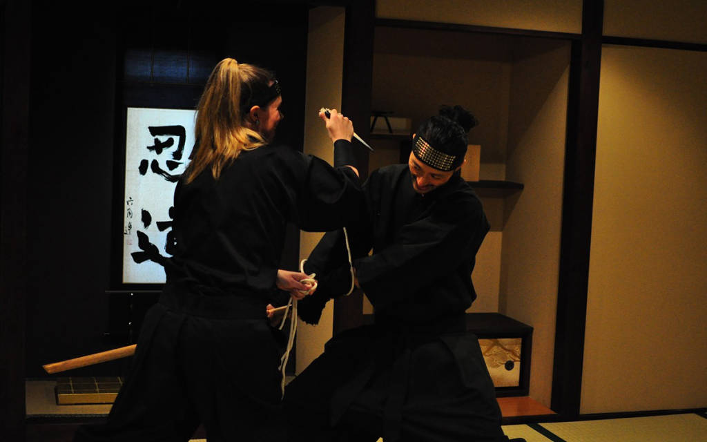Khi nhắc tới các samurai thì người ta không thể không nhắc đến ninja những hình ảnh đã quen thuộc với nhiều người khi nói đến Nhật, hình ảnh ninja Nhật đã được đưa vào hàng loạt phương tiện truyền thông giải trí từ phim ảnh, truyện tranh đến tiểu thuyết khắp thế giới. Trải nghiệm khóa học Ninja và samurai ở bảo tàng ninja và samurai ở Kyoto bạn sẽ có 1 chuyến thăm quan xung quanh miễn phí ở bảo tàng Ninja Kyoto. Bạn sẽ được các nhân viên ở giới thiệu bảo tàng được tìm hiểu về lịch sử của Nhật bản cũng như các trang phục của các chiến binh samurai thời xưa. Sau đó bạn sẽ đăng ký lớp học trở thành ninja hoặc là trở thành samurai. Các lớp học này đều rất thú vị cho bạn những trải nghiệm rất hay, nếu tham gia vào lớp ninja bạn sẽ được mặc trang phục ninja hóa thân thành các chiến binh ninja, tập ném các ngôi sao ninja vào các mục tiêu có sẵn, sử dụng súng phóng tiêu của ninja. Còn nếu bạn vào học lớp samurai thì bạn sẽ được các nhân viên hướng dẫn sử dụng những thanh kiếm thật học về kiếm thuật, kết thúc khóa học bạn sẽ sử dụng những thanh kiếm để chém vào mô hình có sẵn ở đây. Thời gian cho mỗi khóa học thường kéo dài từ 1 đến 2 tiếng tùy thuộc vào các khóa học bạn đăng ký.