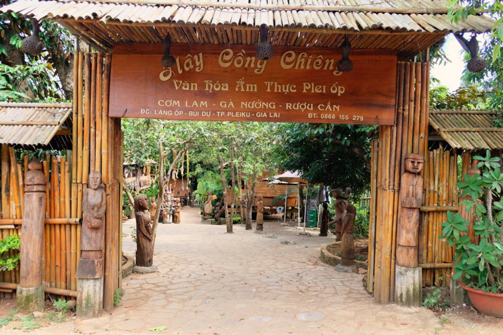Theo một số tài liệu cho thấy, làng Plei Ốp được thành lập vào năm 1927 đến nay cũng gần 100 tuổi. Làng nằm ngay giữa trung tâm thành phố Pleiku chỉ cách quảng trường Đại Đoàn kết khoảng chừng 3km. Diện tích tự nhiên ở trong làng khoảng trên 182 ha, với khoảng 105 hộ gia đình và 540 nhân khẩu nằm trên địa bàn phường Hoa Lư. Đến với làng Plei Ốp, ngoài việc ghé thăm ngôi nhà rông truyền thống, nơi diễn ra những nghi lễ quan trọng của làng thì du khách có thể thong dong thả bộ trên những con đường làng sạch sẽ, thoáng đãng và trò chuyện với những người dân thân thiện, hiếu khách. Hay ghé thăm bến nước Ia O, nơi người dân Plei Ốp thường hay tắm giặt, trò chuyện với nhau về việc nương rẫy vào mỗi cuối chiều. Bên cạnh đó, trong làng còn có một số nghệ nhân lớn tuổi còn khả năng truyền đạt, những bài cồng chiêng trầm hùng, những điệu xoang uyển chuyển cho trai gái trong làng để thể hiện nên những nét độc đáo, riêng biệt của văn hoá Jrai. Nếu may mắn, khi các nghệ nhân trong làng đang tận tình truyền đạt lại cho những người trẻ thì du khách có thể tham gia vào để trải nghiệm và học hỏi những động tác cầm dùi đến gõ nhịp chiêng, rồi kỹ năng diễn tấu những bài chiêng cơ bản nhất. Ngoài ra, du khách cũng sẽ khá thú vị khi được nghe già làng Puih Sir hát dân ca hay được già đưa đi tìm hiểu các nghề truyền thống còn được dân làng lưu giữ như: rèn, đan lát, dệt thổ cẩm, tạc tượng, làm nhạc cụ dân tộc… Một điểm thú vị khác ở làng Plei Ốp đó là làng có tới ba quán ăn chuyên phục vụ ẩm thực núi rừng Tây Nguyên. Trong đó, nhà hàng Plei Cồng Chiêng là một trong ba nhà hàng nổi tiếng ở đây. Tại đây, du khách không chỉ được thưởng thức đồ ăn sạch mang hương vị núi rừng mà còn được chìm đắm trong không gian, đời sống tinh thần đặc trưng của người Gia Rai. Quán có không gian kiến trúc là các nhà sàn nhỏ, nhà dài truyền thống thoáng mát, cây nêu trang trí hoa văn rực rỡ giữa sân. Bên trong nhà sàn nhỏ, các nhạc cụ như: cồng chiêng, đàn goong, đàn tơ nưng, thổ cẩm, dụng cụ lao động được treo trang trọng trên các vách gỗ, vách nứa. Chung quanh dựng rất nhiều tượng gỗ miêu tả sinh hoạt cuộc sống của người đồng bào Jrai như tượng mẹ ôm con, chàng trai múa trống, người ôm bầu nước, chàng dũng sĩ, cô gái múa xoang... Quán phục vụ rất nhiều món ăn ngon của núi rừng Tây Nguyên như heo rừng nướng, cơm lam, cà đắng, rau dớn, lá mì, cá suối nướng ống lồ ô, bò một nắng muối kiến, canh gà lá giang... Tuy nhiên, món ăn nổi tiếng thu hút du khách nhất tại đây chính là gà nướng ăn cùng cơm lam. Món gà nướng Gia Rai này độc đáo khác biệt ở chỗ nướng xa lửa, lấy hơi nóng tỏa ra để gà chín từ từ. Gà được chọn thường từ 1,5kg đổ xuống, cho vào chậu thấm đẫm gia vị để ướp, gồm mật ong, tỏi băm nhuyễn, dầu mè, muối, tiêu sọ... sau đó đem kẹp cả con vào khúc cây lồ ô đã chẻ đôi sau đó cắm thành hàng hoặc vòng tròn chung quanh đống than lớn, cứ mười phút lật một lần để lớp thịt bên trong chín đều, lớp da bên ngoài có màu vàng ươm hoặc vàng sậm. Những giọt mỡ tan chảy từ trong thớ thịt, tỏa mùi thơm nức đủ khiến người ăn phải phát thèm.