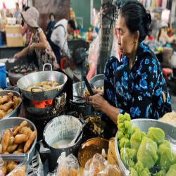 Các lựa chọn ẩm thực tại chợ Hàm Tiến đa phần là các món ăn nhẹ và đồ uống, đặc biệt là gỏi cá mai, chả cá, bánh căn, bánh xèo, bánh hỏi lòng heo,…