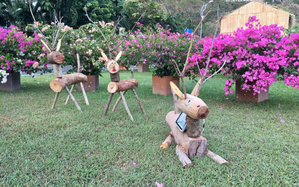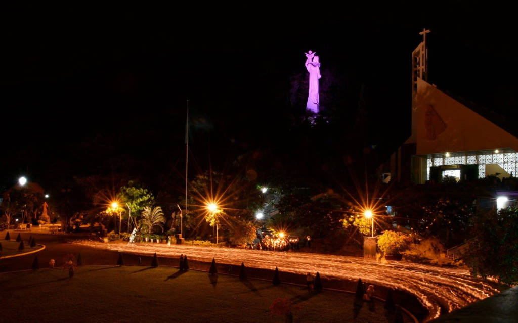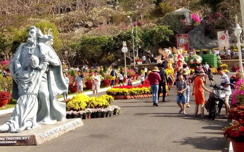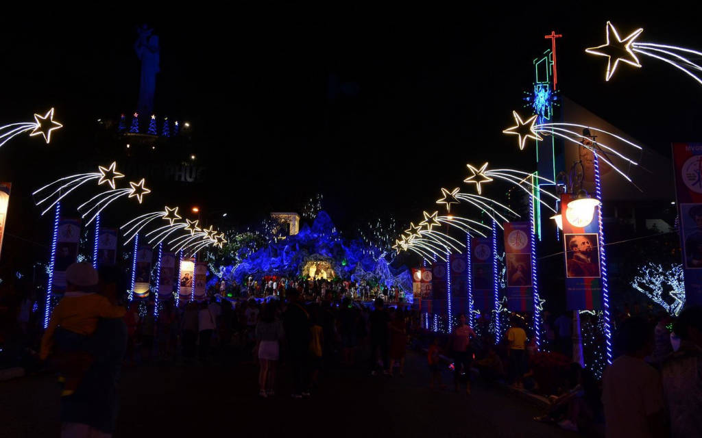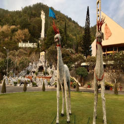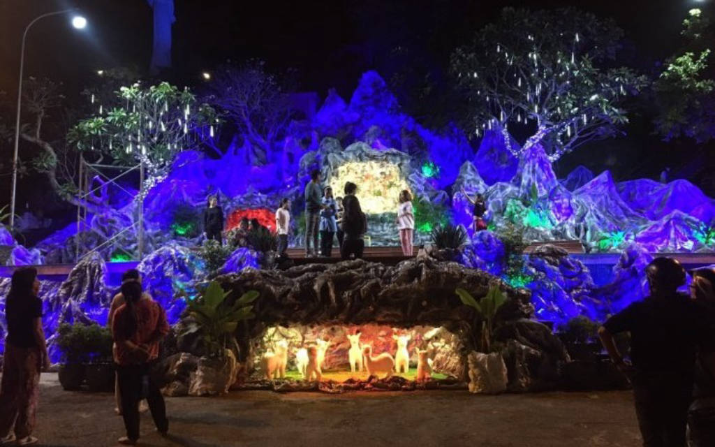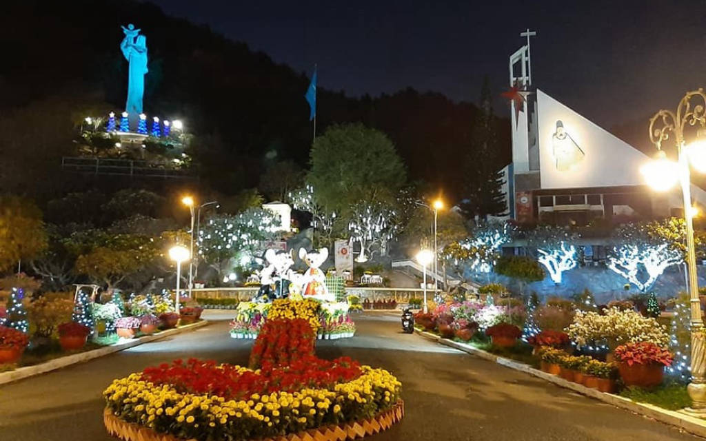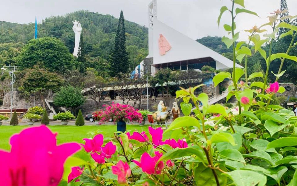 When coming to Bai Dau Parish Church, you will feel the coolness and tranquility inside the campus. In the campus, there are many paper flower pots along the two sides of the road to the church, creating a beautiful scene for visitors to visit. The facade of the church is designed to take the shape of a sail stretching the wind to the sea, creating a highlight for the church. Bai Dau parish church is a complex of works including many works such as shrines, chapels, souvenir stalls.... Especially here there is a statue of Our Lady, when you look from afar you will see a striking image with a huge white statue of Mary raising her hand when she was a child. The statue was built in 1992 and inaugurated in 1994, the statue is 25m high, placed on the 60m high Lon slope. To get to the statue you have to go up 115 stone steps, along the two sides of the steps are planted a lot of white porcelain flowers, giving off a fragrance that makes visitors feel very comfortable. At the foot of the statue of Our Lady, everyone has a feeling of excitement when admiring the sea and sky, enjoying the sea breeze blowing in. If you come here on Christmas, you will have a church scene decorated with many beautiful miniatures, which is quite interesting, some are made from recycled materials but under the talented hands of common people. come to life like reindeer made of logs, white snowmen made of recycled tires. In the evening, the church scene shimmers with hundreds of twinkling lights on the trees, the statues make the atmosphere become dreamy.