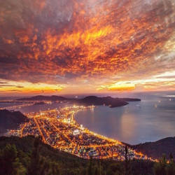 Tuy nhiên, núi Vũng Chùa đẹp nhất có lẽ là thời điểm giao thoa giữa ngày và đêm. Lúc bình minh, những tia nắng mới bắt đầu chiếu xuyên qua những đám mây, tạo thành những vệt vàng rực rỡ dưới chân trời khiến không gian trở nên lung linh, huyền ảo. Và khi hoàng hôn buông xuống, khung cảnh được bao phủ bởi một màu vàng cam ấm áp mang đến một khung cảnh thơ mộng và trữ tình đến lạ.
