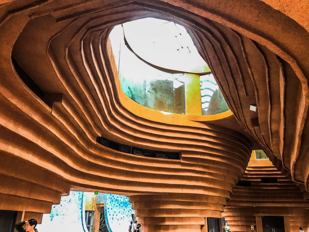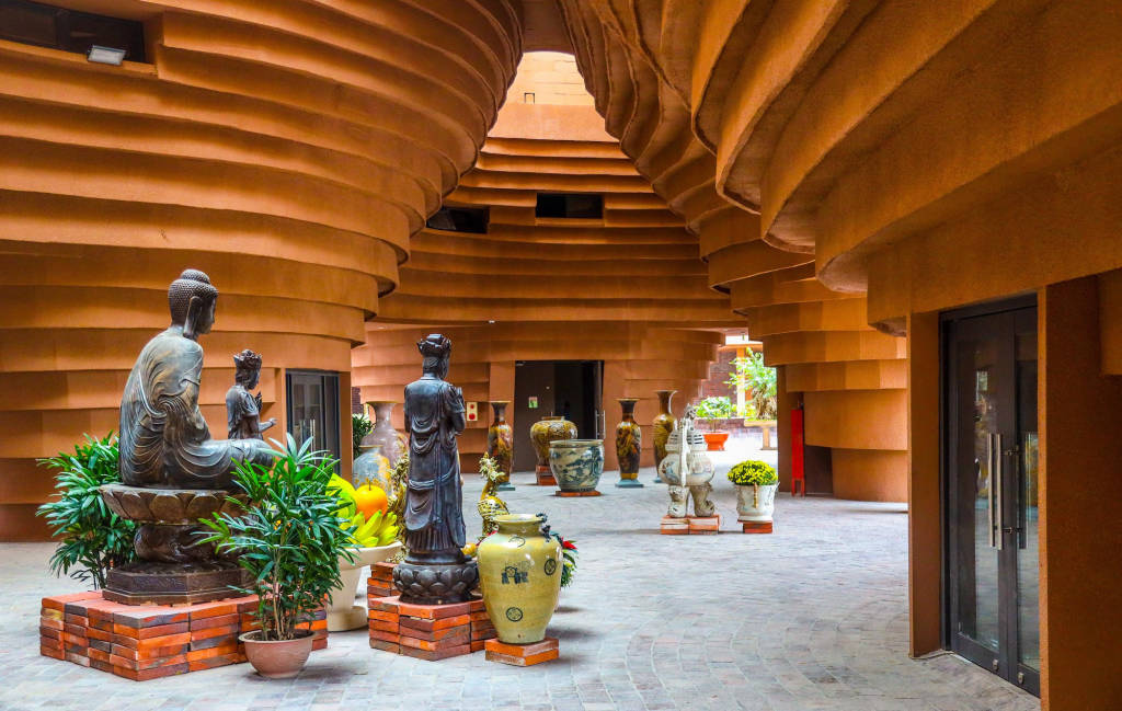 The museum consists of seven interlocking funnel-shaped buildings, the outer walls are also carved with multi-layered patterns to form a unique work. The design is said to have been inspired by the ceramic turntable - a potter's signature tool. From another angle, the museum building resembles the image of a giant ancient pottery kiln of the ancient Bat Trang people. The work also makes the most of the ancient materials of Bat Trang Village such as traditional ceramic tiles, mosaic tiles, and fired tiles to bring the most realistic colors to the museum.