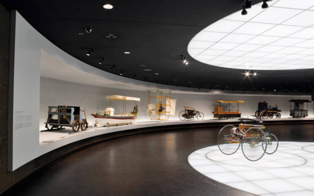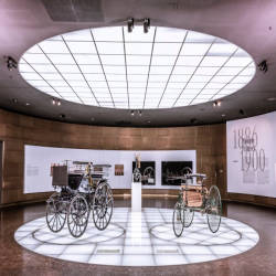 The exhibition concept itself is an original design developed and executed by HG Merz, Stuttgart and Berlin. In a two-hour walk through the museum, visitors will enjoy a unique journey through time throughout 120 years of automotive history. They are transported by elevator to the top floor, from where the two tours return to the starting point following long curves through the extensive collection.