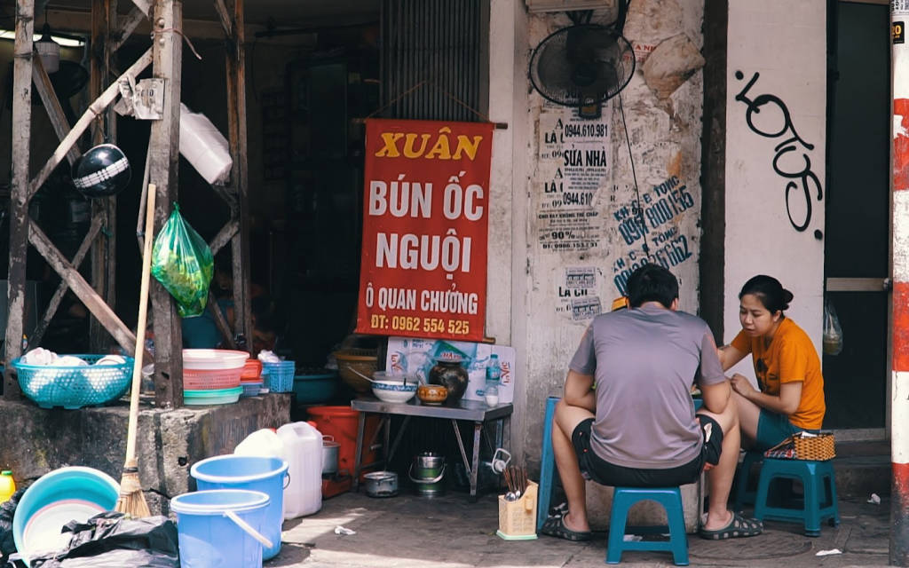 In Hanoi now, there are also very few places that still sell cold snail vermicelli, not everywhere like other Hanoi specialties, that's important to remember, the most familiar addresses are the noodle shops on the street. Bui Thi Xuan Street, Nha Chung, Luong Ngoc Quyen. And most famous of all is the half-century old cold snail noodle soup located at the beginning of O Quan Chuong. The shop is only a corner of Dao Duy Tu street intersecting with Hang Chieu, there is no signboard, only a few sets of modest tables and chairs, buckets of bowls and chopsticks are lined up behind a huge old-fashioned electric pole, standing in the middle of the intersection. see immediately.