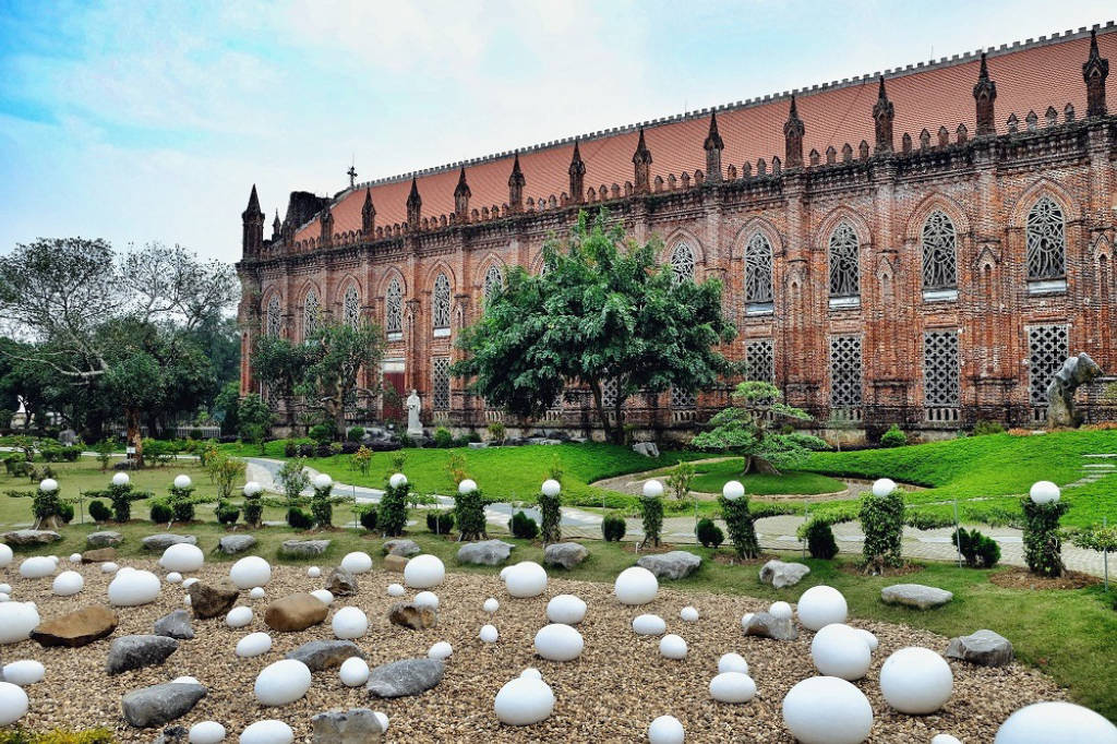 After visiting the cathedral, you can take some time to walk or take advantage of one-of-a-kind virtual live photos in the monastery's campus area. This place has a fresh atmosphere with green pieces of trees, grass, lake with rock formations, giving you a peaceful feeling when immersing in nature, suddenly hearing the piano sound again. chant or hymn resounded from within the cathedral. You will be lost in a fairy garden where there is a legendary fairy castle and a shady garden. In addition, you should not miss some excellent check-in places here such as at the artificial egg stone beach, laterite well or the rock cave behind the Monastery.