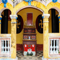 Giac Vien Pagoda has a special architectural form which is synthesized from many building materials as well as many different historical periods. The structure of Giac Vien pagoda consists of two houses with four interconnected pillars. The front house is the main hall used to worship the gods, the back house is the lecture hall and the living room. There are two corridors named East corridor and West corridor connecting to the main house. Along the two rows of corridors East and West, there are small altars with worshiping objects. In particular, there are wooden columns carved with bilingual sentences. The letters are finely carved and lacquered, inlaid with gold. Behind Giac Vien Pagoda, there is a small path, the garden behind the pagoda is planted with many rare and ancient ornamental plants, creating a quiet and dignified scene.