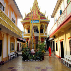 Inside, visitors can find a grand seated Buddha statue surrounded by frescoes illustrating Buddhist stories, immersing visitors in the tranquility of the temple and offering insight into Buddhist teachings. Each detail reflects the reverence and devotion of the Khmer community to Buddhism.