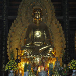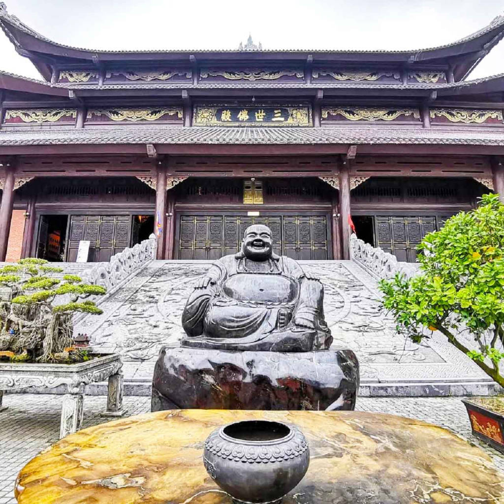 Built in 2003, the new Bai Dinh pagoda area is a large project of regional stature, including Buddhist architectures such as Tam The Palace, Quan Am Palace, Bell Tower, Bao Thap, Maitreya Buddha statue. and other auxiliary works such as: Buddhist academy, reception area, Tam Quan foreign, Tam Quan interior... The main architecture of the works in the new temple area bears the imprint of Vietnamese traditional architecture. . During construction, the pagoda was dubbed the "great construction site" because it mobilized and gathered more than 500 artisans from many different traditional craft villages in the region and neighboring provinces such as: Phuc Loc carpentry village, Ninh Van stone carving village, Van Lam embroidery village, Silver Dong Gray village, Bat Trang pottery village... Visiting the new temple area, you will be amazed with the 3-storey Bell Tower, each floor consists of 8 interwoven roofs. looks like the shape of a lotus - where Dai Hong Chung and the largest bronze drum are kept in Vietnam. Or you can relax while walking around the Arhat Lang Lang, consisting of 234 compartments connected to the two ends of the Tam Quan gate with a length of 1052 meters, where the residence of 500 Arhats is delicately carved with monolithic green stone. Or you can visit the tallest Buddha Relic Stupa in Southeast Asia, 100 meters high, including 13 floors, built in the shape of a Hexagon, where the relics are displayed from far away India.
