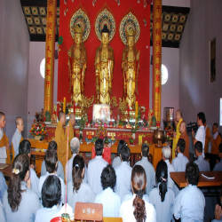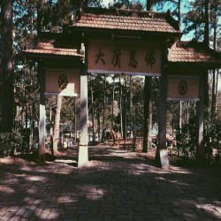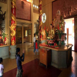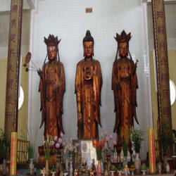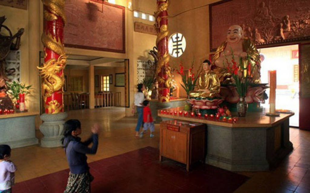 Inside Quang Minh Bao Dien, this is the main work of the famous temple with three Buddha statues weighing 1500kg, made entirely of Agarwood wood, invited by a monk named Da from Hong Kong. In addition, the temple is also famous for its turntable that makes visitors come here very curious, just put your hand on the table and close your eyes and think about the direction the table wants to rotate for a while. force is required. The temple not only possesses strange architecture, but the temple is also quite large, the scenery around the temple is very airy and peaceful, this is also a destination for visitors to relax and immerse themselves in nature. life chaos.