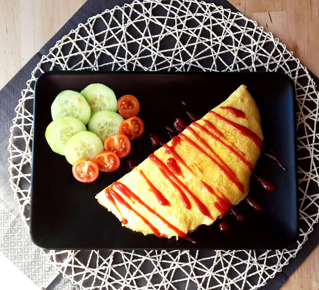 When the eggs are almost cooked, quickly place the fried rice in the center. Fold the 4 sides of the omelette to cover the rice. Place a flat plate over the omelette and carefully flip it over. Finally, garnish with some ketchup or chili sauce on top