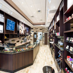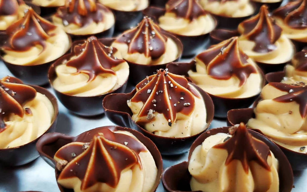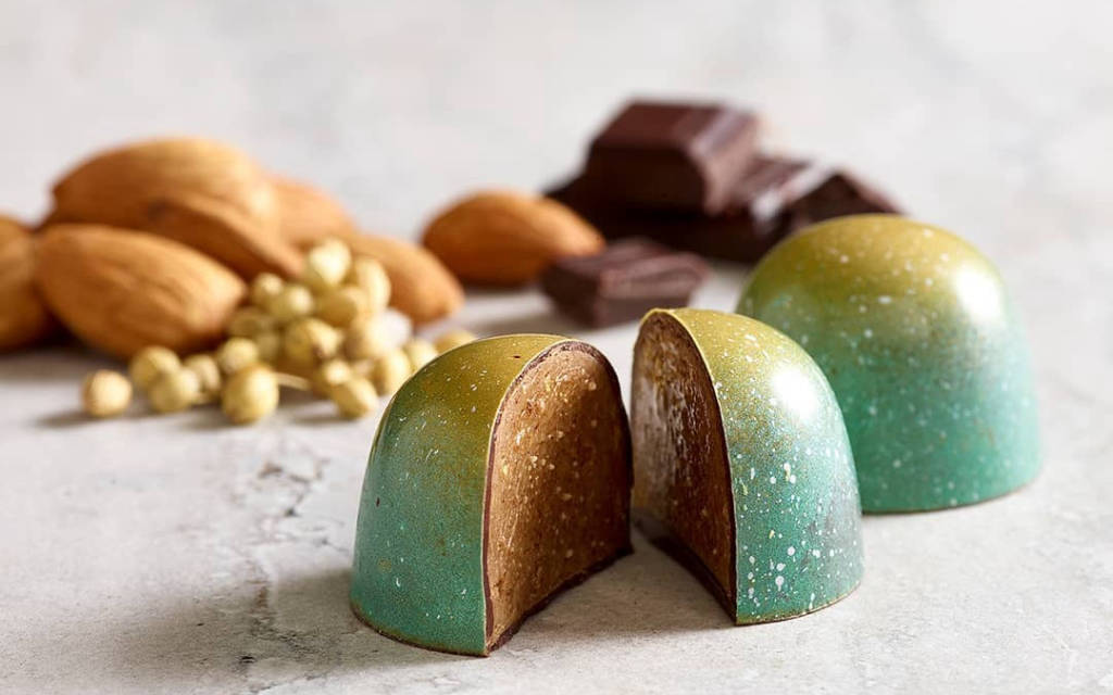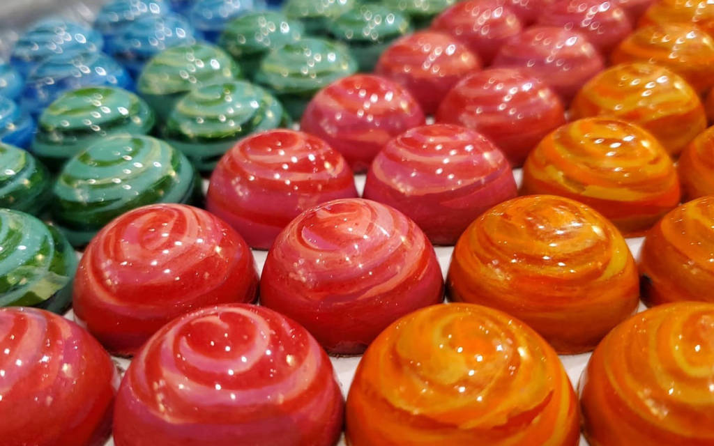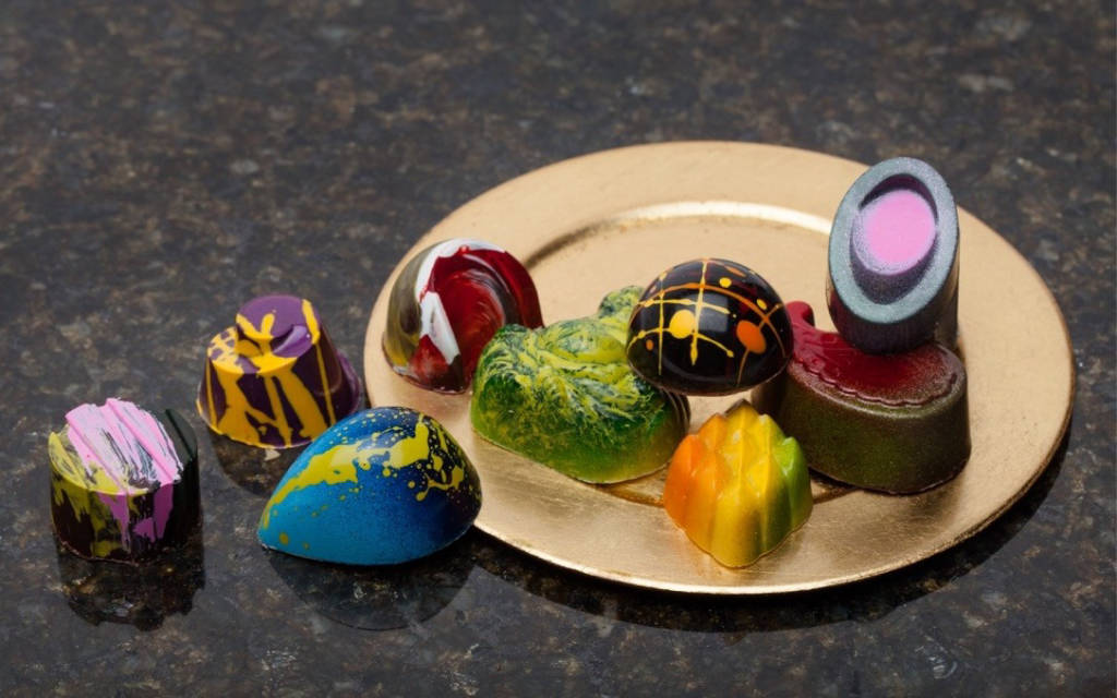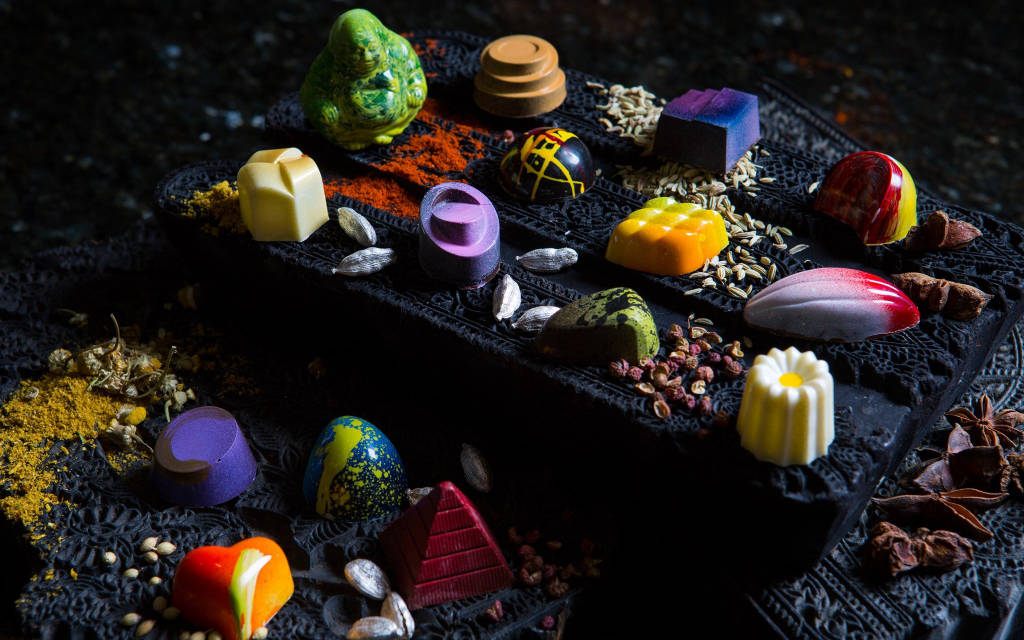 Inside the store, colorful chocolates line up in display cases like what visitors would expect from a jewelry store. Cacao & Cardamom's menu features over 40 types of bon-bon chocolates and many other specialty chocolates such as HIVE Honey & Thyme (milk chocolate and thyme infused with honey glaze). from HIVE Bee Farm), Olive & Oregano (spicy caramel marjoram dark chocolate with kalamata crumbs from Breadman bakery), Fig & Malbec (where dark chocolate glaze is made from alcohol) Nice Wines with fig jam) or Double Goat (homemade caramel with sweet goat's milk and dark chocolate glaze made with goat cheese from a local farm).