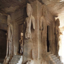The walls of the caves, perched atop a hill, are lined with rock art that experts say date back to between the 5th and 6th centuries. There are two main hills on the island - Gun Hill. and Stupa Hill. Gun Hill got its name from the two British-era cannons placed on it, and Stupa from the remains of a Buddhist stupa unearthed here. The most intricately detailed and architecturally majestic cave in the Elephanta network is located on Gun Hill. The plaques on these caves depict the life and beliefs of the esoteric Pashupati sect of the Shaiva system. A 7 m high sculpture called Sadashiva is located at the entrance of the cave.