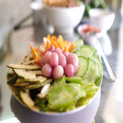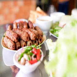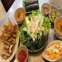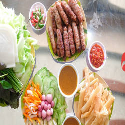 After cooked, spring rolls are used with raw vegetables, cucumbers, bananas, star fruit, and crispy fried rice paper. All of the above ingredients are rolled together with thin rice paper and served with a well-prepared broth. Sweet and spicy chili sauce is also an indispensable ingredient to make Ninh Hoa grilled spring rolls brand.
