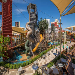 Inside the heart of Downtown Container Park is a children's playground area consisting of an artificial tree and treehouse made from four shipping containers, with slides and interactive game boards. Kids can also play with the NEOS Playworld System, a video game that encourages them to race around while tapping on flashing lights.