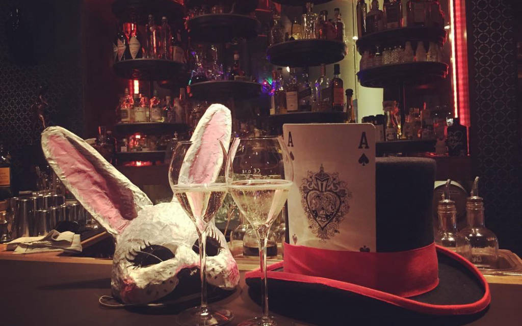 The shop is built in an unusual but imaginative style like the movie "Alice in Wonderland" by Tim Burton. Bar entrance is only available upon request when the bell rings. A line "Follow the white rabbit" appeared on the road to guide the entrance. All staff here are dressed in fairy tale themes.