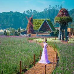 Located at 90B Van Thanh Ward 5, about 4 km from the center of Da Lat, Fresh Garden is an eco-tourism destination that combines flower cultivation and artistic landscape. Established in 2019, with a large area, it is distinguished by meticulously managed-for colorful flower beds, harmonized with creative architecture inspired by ancient Europe. Surrounded by lush pine forests, Fresh Garden offers a serene and peaceful space, ideal for visitors seeking harmony with nature.