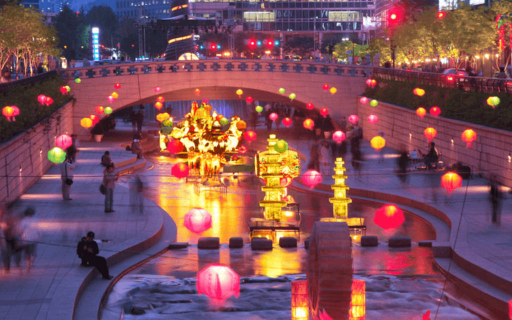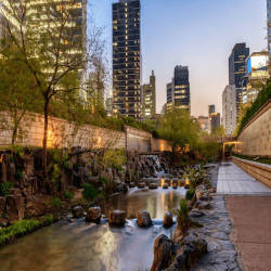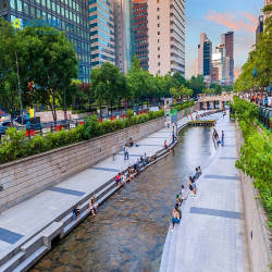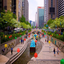 Suối Cheonggyecheon có chiều dài 5.8km chảy từ Tây sang Đông đi qua một nửa phần phía Bắc của trung tâm thành phố Seoul sau đó từ từ chảy ra sông Hàn.̣