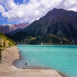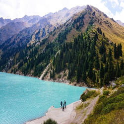 Great Lake Almaty is a natural water reservoir located atop Mount Ili Alatau ca at 2,511 meters above sea level, set against the background of three peaks jutting over a craggy gorge including Sovetov (4,317 m), Ozyorny (4,110 m) and Turist (3,954 m). The color of the great Almaty Lake changes depending on the time of year, but the most beautiful and brightest is turquoise during September and early October. The lake is lighter blue in spring due to the influence of snow. melt.
