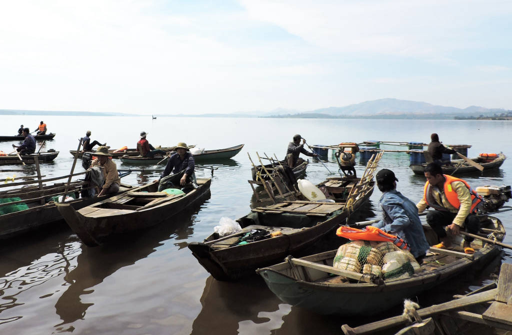 In addition, around the lake bed are hundreds of large and small islands jutting out of the clear blue water, fish cages scattered in the lake bed, Xo Dang ethnic villages hidden on the mountainside, Ro waterfall Xia is vast, roaring with white foam, majestic in the upstream... all nature blends together to form a pristine, clear and attractive ink painting for those who came here.