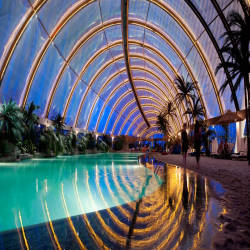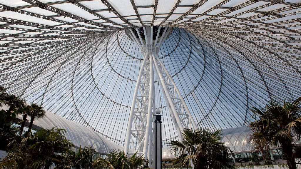 Khan Shatyr is a giant 150m-high tent with a 200m-long elliptical base covering an area of 140,000 square meters. The area below, which is larger than 10 football stadiums, is a complex that includes an internal park, large-scale shopping and entertainment venues, along with a square and cobbled street area, a river and a river. boating, mini golf and indoor beach resort. The fabric roof is constructed of ETFE cushioning provided by Vector Foiltec suspended from a network of cables strung from a central spire. Shielded with transparent construction material that allows sunlight to pass through, combined with a stacking effect, heating and air cooling, designed to maintain an internal temperature of 15–30 °C in the main space and 19–24 °C in the retail stall areas.