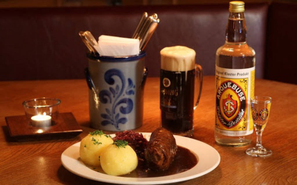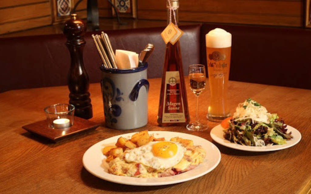 Today, the restaurant is still a place to cook a variety of traditional hearty dishes in a cozy style with brown wood-paneled tables and walls. In addition to the ciders and draft beers from the tap, the restaurant also offers Riesling wines, some monastic wines and liqueurs from Andechs, Furth, or St. Gilgen for diners to enjoy after a meal.