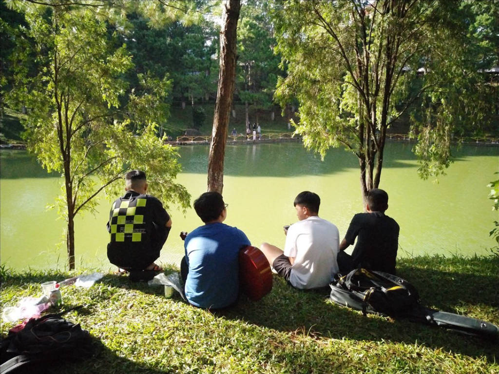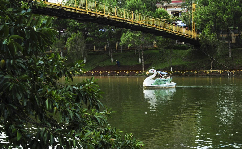Continuing along the lakeshore to the right, visitors will meet Thuy Ta Cafe, one of the quite famous cafes here. Not luxurious tables and chairs, not fussy in drinks, but Thuy Ta attracts visitors with "specialties" that are difficult to find. Sitting at the bar, you can have a panoramic view of Dien Hong Park, the beautiful little bungalow on the other side of the aisle, the lake's watery waves, and the yellow suspension bridge imprinted with the footprints of many couples. Perhaps the open and charming landscape here has become an unforgettable mark to be able to hold back and return.