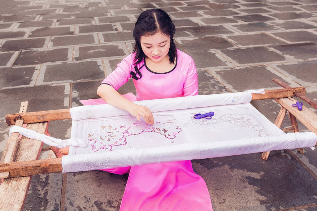 Van Lam women take advantage of embroidering their products at Tam Coc wharf while waiting for guests to sail. As a profession passed down through generations, most Van Lam people are engaged in embroidery. Men in the village are as proficient at embroidery as women. With thin, colorful threads, skillful hands of local artisans have created delicate and beautiful embroidery products like artistic masterpieces. For Van Lam villagers, embroidery is a detailed profession, so they cannot say how long it takes to make an embroidery picture because it depends on the type of painting they are doing. It takes more time to create more detailed and larger pictures. Craftsmanship requires artisans to master each stage.