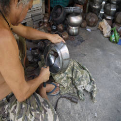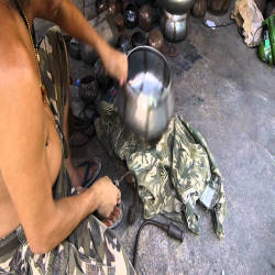 Để làm ra một chiếc bình bát, mỗi nghệ nhân trong làng có thể mất cả ngày. Đầu tiên, vành thép của bát được tạo hình thành hình tròn trên một khối gỗ. Hai dải thép được hàn với nhau theo hình chữ thập trước khi gắn vào vành để tạo thành khung. Hình chữ thập đại diện cho bốn hướng chính.