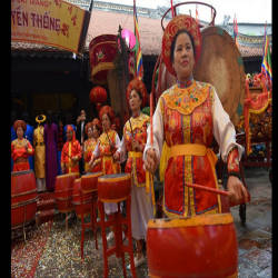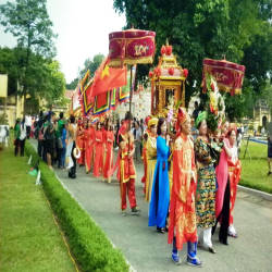 The festival has many performances, the most unique is the human chess game and worship singing. According to custom, before the festival, the village chooses two chess ladies who are the most virtuous and richest people in the village. Each general received 16 beautiful girls aged 10 to 15 years old, fed and fed, and sewn beautiful clothes. The girls were trained to be chess pieces for a month before they could perform and compete in the communal house yard.