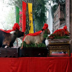 The ceremony of offering to the emperor is a fat, golden buffalo, the whole child is placed on a large table, accompanied by six trays of food and four raspberries. After the ceremony is over, the items are lowered and divided equally among the families.