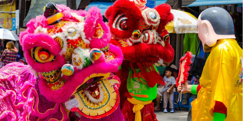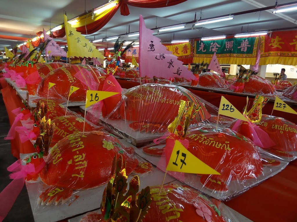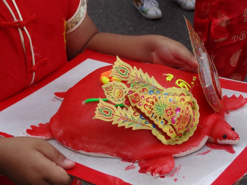 During the festival period, there will usually be several large parades taking place. Local students and students wear their best traditional costumes, many of the girls wear Chinese-style costumes with striking red colors accompanied by flowers, red turtle cakes, and fruits to the temples. Red turtle cake (ang ku) is a traditional cake during the Por Tor festival, a mandatory offering on the altar, it is made from flour and sugar in various sizes. For the Chinese, the tortoise symbolizes strength and is a symbol of longevity. In addition, red often brings good luck.