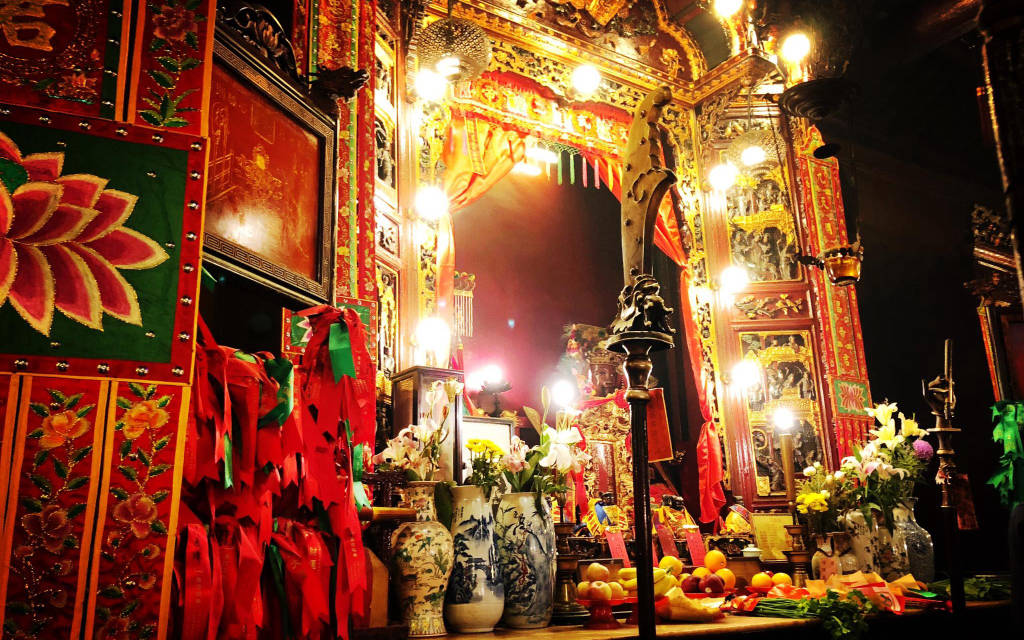 Stepping inside the temple grounds, you will easily recognize two deities worshiped in a dignified and noble manner. Next to it are two elaborately carved 19th-century traditional Chinese procession chairs, used to transport the two to annual festivals in the vicinity. A sense of sanctity and warmth also covers the entire center of the main hall with spiral incense coils suspended overhead, like mushrooms overgrown in an upside-down garden. Next to it is a dignified area, Liet Thanh Cung, a place of worship for other Taoist and Gong deities, once used as a court of spiritual justice to settle community disputes before the feudal system. The modern judicial system was born. A couplet at the entrance advises people to shake off their selfish prejudices and anger outside; try to keep a good mind to have a more peaceful and better life ahead. If you believe in fortune-telling, you can try reaching out to one of the fortunetellers who are always available in the shrine.