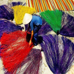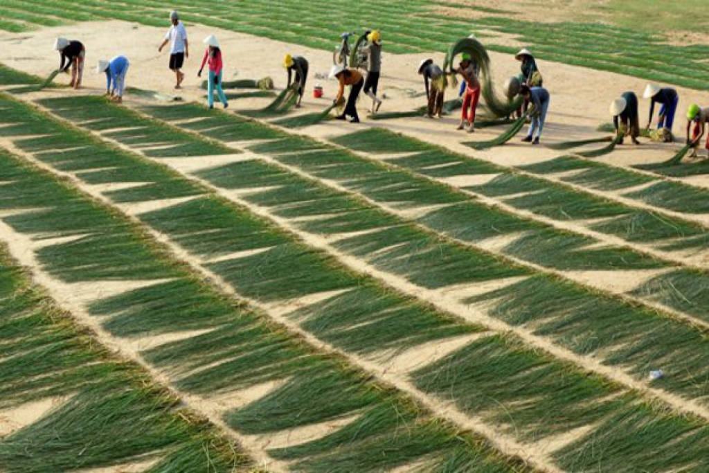 Growing, tending, harvesting sedges and turning them into white, durable fibers for weaving mats is the daily work of the people here. There are many steps in the preparation of sedge. Sometimes workers have to leave their meals unfinished in order to bring sedge into the house if it rains.