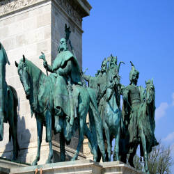 The high column in the center of the monument is a statue of the Archangel (Archangel) Gabriel, with the symbols of the Kingdom of Hungary in his hands being the crown of Saint Hungary and the Apostolic cross. At the foot of the monumental column are Prince Árpád and six other Magyar chiefs, who occupied the Carpathian region at the end of the 9th century. The 14 statues in the back colonnade are of rulers and statesmen – from King Stephen (far left) to Lajos Kossuth (far right).